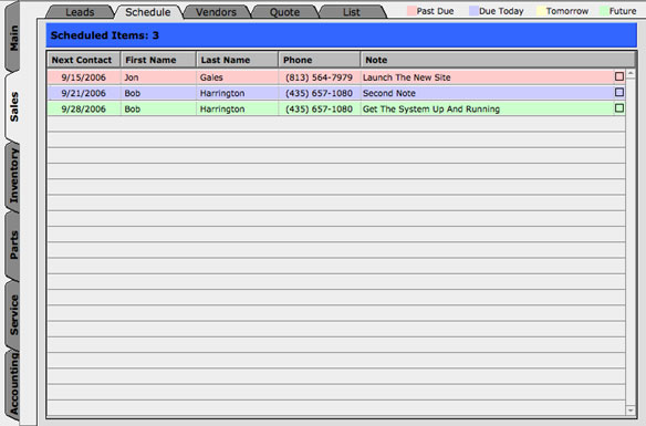 On this screen you can see how the system will remind you of events that are upcoming. If you need to remember or remind a customer of a service appointment that is coming up you can enter that information into the system and it will show on your schedule.
